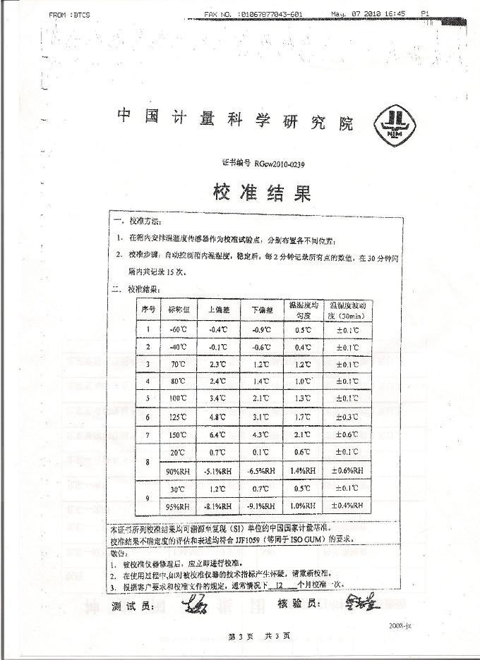 >>高低溫濕熱試驗箱校準證書-中國計量院-國家雷電測試