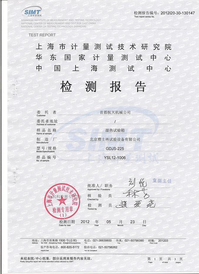 >>高低溫交變濕熱試驗(yàn)箱檢測報(bào)告-上海計(jì)量院-首都航天