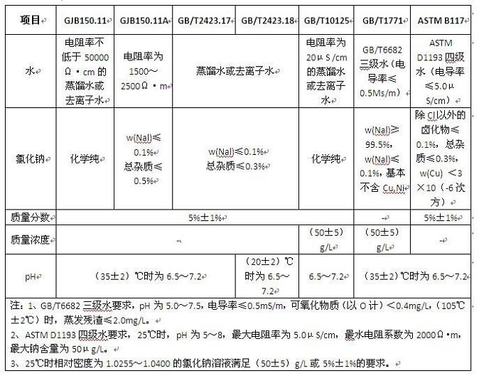 在鹽霧試驗箱不同標準中對鹽霧試驗用的鹽溶液有不同的要求,見下表: