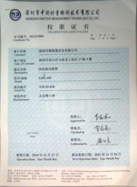 高低溫交變濕熱試驗(yàn)箱校準(zhǔn)證書-深圳中測(cè)計(jì)量-深圳精銳通